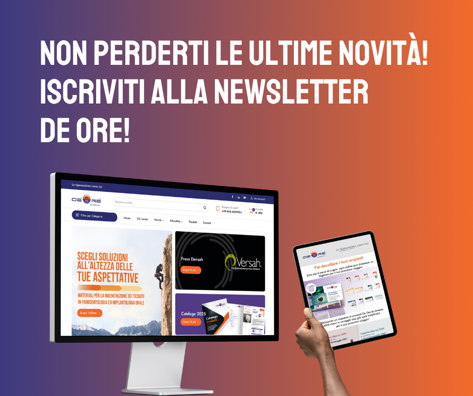 De Ore® è un’impresa specializzata nella rigenerazione dei tessuti in parodontologia ed implantologia orale: temi sui quali vuole essere il punto di riferimento per tutti i professionisti del dentale. L’obiettivo è quello di instaurare fiducia e a supportare concretamente le tecniche rigenerative più efficaci attraverso una gamma completa di biomateriali rigenerativi accuratamente selezionati a livello internazionale.