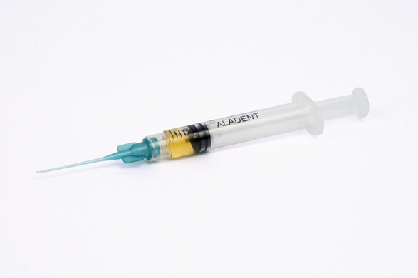 1. Erogare Aladent nella tasca/tasche tramite un capillare applicato alla siringa fino alla fuoriuscita del gel.