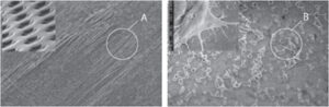La superficie ultrastrutturale della membrana si caratterizza anche per la presenza di solchi e fibrille (A) parallele da 1 a 3 µm di diametro che aiutano l’alloggiamento delle cellule (SEM 1.500 x) e per la presenza di nanopori (B) inferiori a 0,3 µm (SEM 20.000 x) che prevengono la migrazione batterica e di cellule indesiderate attraverso la membrana ma permettono la diffusione di piccole molecole organiche ed ossigeno che sono importanti per facilitare l’adesione cellulare.